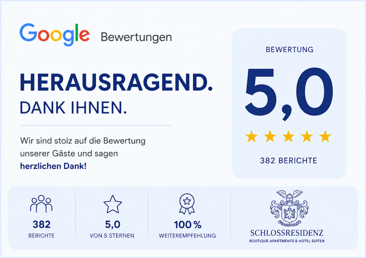 Unsere Schlossresidenz ist weit mehr als ein Hotel – es ist Ihr Zuhause auf Zeit, geschaffen für Wohlbefinden und Entspannung in einzigartigem Ambiente. Um diese besondere Ruhe zu bewahren, begrüßen wir ausschließlich erwachsene Gäste ab 18 Jahren. Wir lieben Kinder, doch unsere Residenz ist bewusst als Rückzugsort für Erwachsene gestaltet. Auch Haustiere können wir in diesem Refugium der Erholung leider nicht aufnehmen.